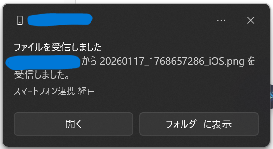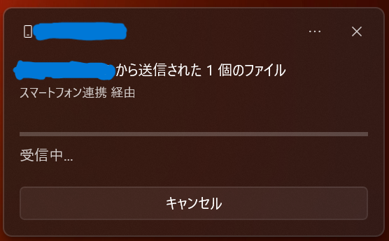 5. PC側で確認:送信されると、画面右下に受信中と送信完了の通知画面が出てきます。