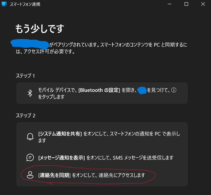 (設定中に確認されるPC側の設定画面の「連絡先の同期」や「品質向上のデータ送信」は嫌だったのでオフにしましたが使用できました。)